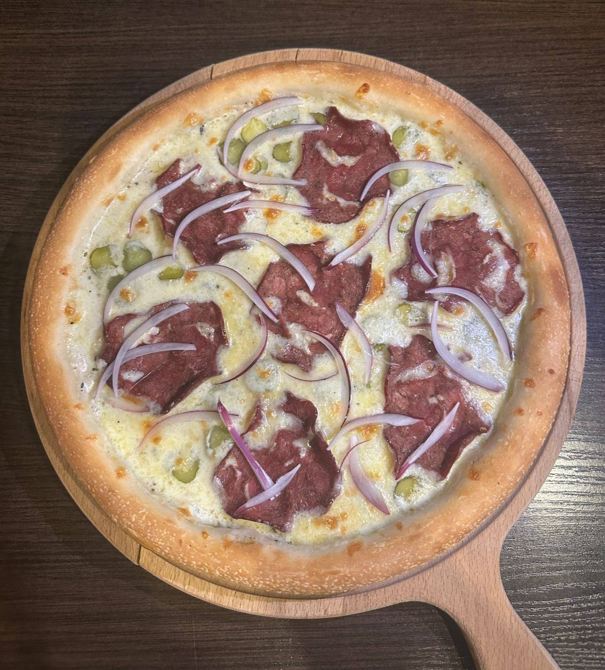 Белый соус, сыр моцарелла, говядина в специях, маринованные огурцы, красный лук.